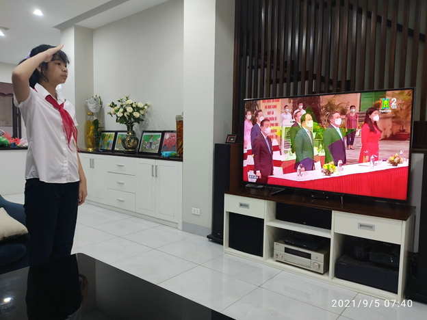 Tuy không đến trường để dự Lễ Khai giảng như mọi năm, nhưng các bạn đã dậy thật sớm, chuẩn bị đồng phục chỉnh tề với một tâm thế vô cùng háo hức chào đón năm học mới. Đúng 7 giờ 30 sáng, buổi lễ được truyền hình trực tiếp trên từ Trường THCS Trưng Vương (Q.Hoàn Kiếm), phát trên sóng Đài Phát thanh và Truyền hình Hà Nội (kênh truyền hình H1, H2 và kênh phát thanh sóng FM). Đây là năm đầu tiên, cùng với hàng trăm ngàn học sinh Hà Nội, các con được dự một lễ khai giảng đặc biệt từ một “điểm trường” qua truyền hình thay vì nô nức đến trường mình đón năm học mới. Để có được điều đó, trước đó, Nhà trường và cô giáo chủ nhiệm đã làm rất tốt công tác tuyên truyền về thời gian cũng như nội dung chương trình khai giảng năm học 2021 – 2022 tới 100% CMHS của lớp qua các kênh như đăng tải các thông báo trên website chính thức của trường, group zalo nhóm lớp, chính vì vậy mà 100% các bạn học sinh đã biết và rất háo hức mong chờ ngày Khai giảng đặc biệt này.