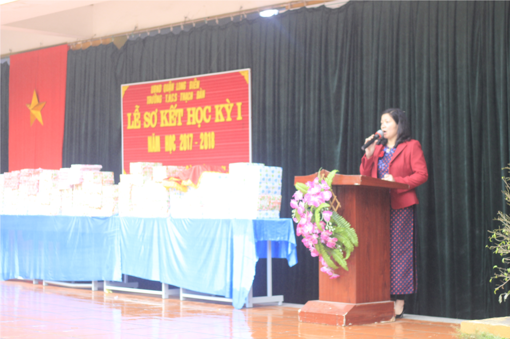 Sau nghi lễ chào cờ, cô giáo Lê thanh Hường – cô tổng phụ trách trường lên đọc báo cáo tổng kết công tác đội trong học kì I năm học 2017 -2018 .Trong bài phát biểu, cô tổng phụ trách nhấn mạnh những thành tích đáng tự hào mà tập thể cán bộ giáo viên, học sinh nhà trường đã đạt được.