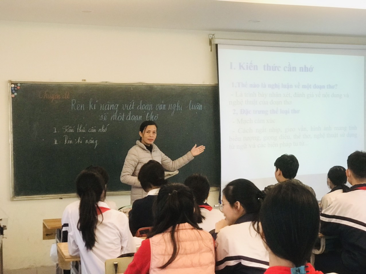 Rèn cho học sinh khối 9 các kỹ năng để thực hiện tốt các yêu cầu trong đề thi môn Ngữ văn thi vào lớp 10 THPT luôn là nhiệm vụ và thách thức đối với các thầy cô giáo giảng dạy Ngữ văn khối 9. Tuy nhiên, đối với cô giáo Hoàng Thị Hòa, một giáo viên có nhiều năm kinh nghiệm giảng dạy môn Ngữ văn 9, rèn kĩ năng cho học sinh viết đoạn văn nghị luận về một đoạn thơ không còn là vấn đề khó. Trong tiết chuyên đề, cô  Hòa đã tổ chức linh hoạt các hoạt động dạy học khoa học, phù hợp, kết hợp giữa các phương pháp truyền thống với các phương pháp dạy học tích cực để phát huy năng lực của học sinh trong giờ học Ngữ văn. Đặc biệt, cô giáo đã bám sát vào đặc trưng của bộ môn, đóng vai trò là người hướng dẫn, tổ chức các hoạt động của học sinh, giúp học sinh phát huy tính chủ động, sáng tạo. Với cách dẫn dắt tự nhiên, nhẹ nhàng của cô giáo, các em học sinh lớp 9D đã được hệ thống lại các kiến thức về  kiểu bài nghị luận về đoạn thơ và được rèn kỹ năng  viết đoạn văn nghị luận về một đoạn thơ với những đề văn cụ thể. Đây thực sự là một tiết dạy hiệu quả đã giúp các em học sinh thấy được những đặc trưng của thể loại thơ từ đó biết cách khai thác, giải mã các tín hiệu nghệ thuật, ngôn từ đưa vào bài làm của mình. Trong tiết học, cô giáo đã đi sâu, nhấn mạnh các yêu cầu cơ bản khi viết đoạn văn nghị luận về một đoạn thơ từ nội dung đến hình thức cách trình bày đoạn văn, cũng như hướng dẫn các em thực hiện quy trình bốn bước khi viết đoạn văn: tìm hiểu đề, lập dàn ý, viết đoạn hoàn chỉnh đến đọc và sửa lỗi đoạn văn. Hiểu được những khó khăn của học sinh khi viết đoạn văn nghị luận về đoạn thơ, đó là không có ý để viết, đoạn văn sơ sài, cô giáo đã tập trung hướng dẫn các em cách tìm ý, xác định lí lẽ, dẫn chứng cần có trong đoạn văn. Từ việc đọc kỹ đề bài, gạch chân các từ ngữ quan trọng trong đề bài đến việc đặt các câu hỏi xác định các luận cứ trong đoạn văn đều được cô giáo trình bày cụ thể và chi tiết. Với sự hướng dẫn tỉ mỉ, cụ thể của cô giáo, các em học sinh lớp 9D đã nhanh chóng nắm được cách viết đoạn văn nghị luận về một đoạn thơ.  Phần thực hành viết đoạn văn diễn ra sôi nổi với sự tham gia nhiệt tình của các em học sinh. Đây quả thực là những kĩ năng vô cùng hữu ích với các em học sinh lớp 9 khi chuẩn bị bước vào một kỳ thi quan trọng. Tiết chuyên đề đã đạt được mục đích đề ra ,          Sau buổi dự giờ chuyên đề bổ ích, đại diện Ban giám hiệu – đồng chí Khúc Thị Mỹ Hạnh, TTCM đồng chí Nguyễn Thị Tuyết và thầy cô giáo trong tổ Văn – Sử - GDCD đã cùng chia sẻ, nhận xét, góp ý, khen ngợi rất chân thành giờ dạy của đồng chí Hoàng Thị Hòa. Tiết dạy thực sự là dịp để các thầy cô giáo trong nhóm  học hỏi, rút kinh nghiệm trong quá trình giảng dạy của mình. .